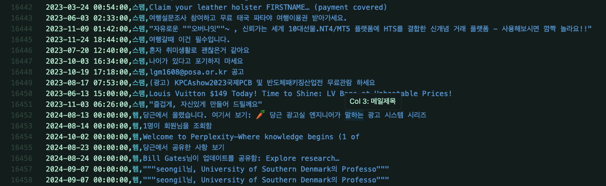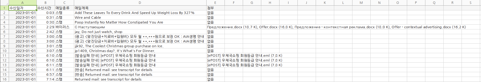 한국우편사업진흥원에서 수집한 스팸, 바이러스 데이터는 구글에 있는 날짜, 시간 내용 등이 없기 때문에 메일제목, 스팸여부로 축소 후 병합하였습니다.